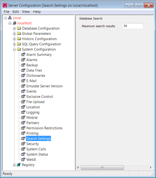 You use the Search Settings section of the Geo SCADA Expert Server Configuration Tool to set the Maximum Search Results value. This value is the maximum number of search results that Geo SCADA Expert will display in the Search Database window when a user performs a database search. For more information, see Searching for Database Items in the Geo SCADA Expert Guide to Core Configuration.