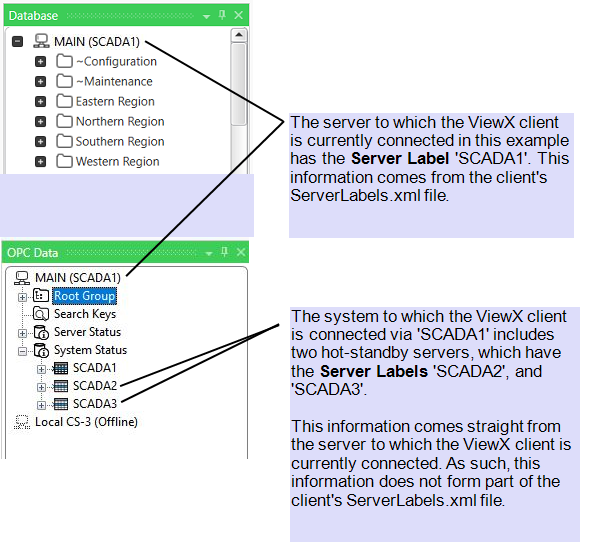 When a ViewX client connects to a Geo SCADA Expert server, Geo SCADA Expert updates that client's ServerLabels.xml file to maintain Server Label information about the server(s) to which the client connects. (The Server Label information might change, for example, if the client's