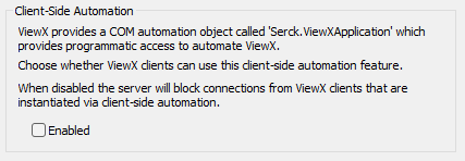 ViewX provides a COM automation object called 'Serck.ViewXApplication' that provides programmatic access to automate ViewX. The Server Configuration tool has a setting that provides a way to block the use of this feature, by preventing ViewX from connecting to the server when it is instantiated via client-side automation.
