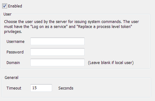 5. Select the Enabled check box to enable system calls. You must now enter the details of the Microsoft Windows® user that you want to use for issuing system calls. Clear the check box if you want to disable system calls (they are disabled by default).
