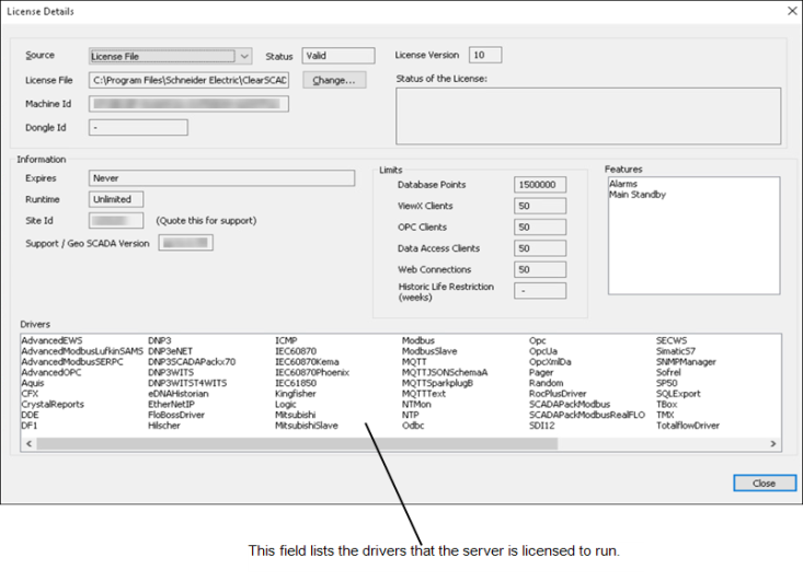 The License Details window on a Geo SCADA Expert server provides information about your license settings and the drivers, database items, clients, and so on, that are permitted on your system.