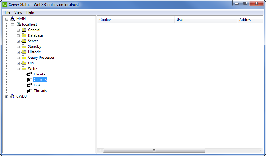 The WebX branch of the Server Status Tool includes a Cookies category. The Cookies category provides status information about each Original WebX cookie that is currently in use.