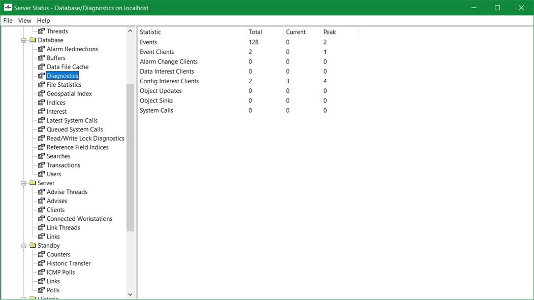 - Data Interest Clients—The Data Interest Clients row shows the Total number of clients that receive interest references from the server (for more information on interest, see Interest). It also shows the Current number of clients that are receiving interest references, and the highest number of clients that have received interest references at the same time (the Peak number of events).