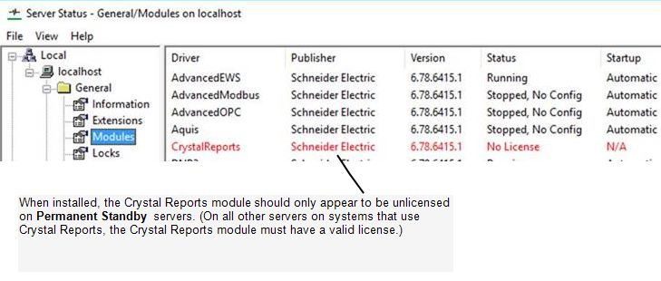 If your system uses Crystal Reports, the Crystal Reports module is likely to be unlicensed on any Permanent Standby servers on your system. This is to be expected due to the lack of a Crystal Reports runtime license. The Crystal Reports prerequisites and driver need to be installed on the Permanent Standby servers in order for the database to synchronize. However, as the Permanent Standby servers do not require the Crystal Reports driver to be operational, they do not require a Crystal Reports runtime license. On all other Geo SCADA Expert servers, the Crystal Reports driver and runtime components must be licensed.