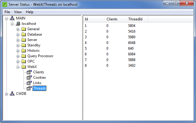 The WebX branch of the Server Status Tool includes a Threads category. The Threads category provides status information about the threads that are used to service the Original WebX links (links between the server and the Original WebX clients).