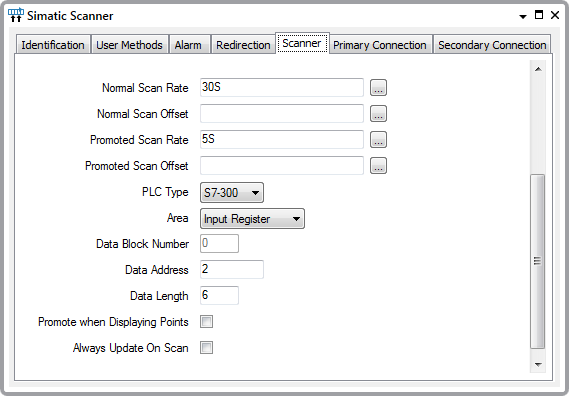 You can also specify whether the scan rate is increased whenever any of the associated points are displayed on a client (see Define Whether a Scanner is Promoted While its Points are on Display in the Geo SCADA Expert Guide to Simple Drivers).