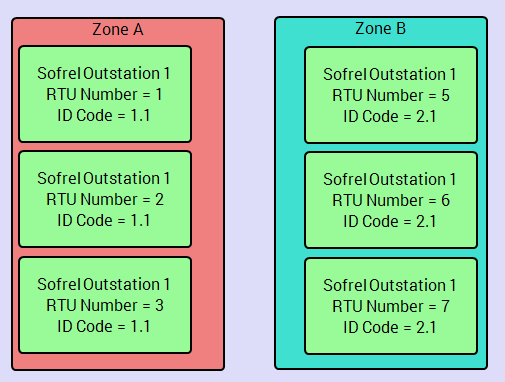 The following diagram illustrates how Identification Codes can be used. In this simple example the Identification Codes are used to label the zone in which the outstations are located, 1.1 = Zone A, 2.1 = Zone B. In each case the combination of the RTU Number and the ID Code is unique.