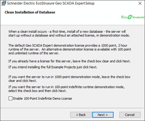 If you do not have a license for the server, you can use the Geo SCADA Expert Installer's Clean Installation of Database window to select the type of demonstration license that you want to use.