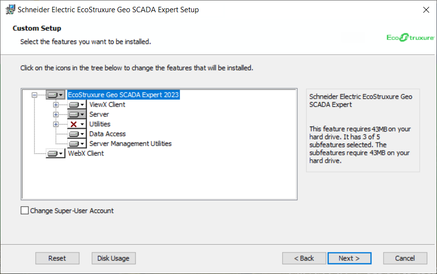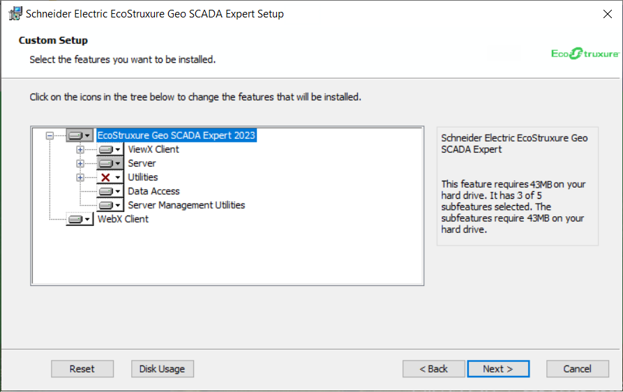 You can select the components that you want to install on the server and clients on your system; to do this, you use the Custom Setup page. On a clean installation, this page is displayed when you choose Custom on the Choose Setup Type page. When installing an upgrade of Geo SCADA Expert, this page is displayed if you select the Change button on the Upgrade page.