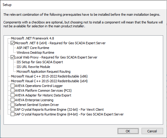 • If the Geo SCADA Expert installer does not run automatically following the reboot, re-run the installer and select the Install Geo SCADA Expert option again (see Run the Geo SCADA Expert Installer). Once the Setup dialog box is displayed, reselect the remaining components that you require (and clear the check boxes of any that you do not require). Then select the OK button to install the remaining prerequisite components that you have selected.