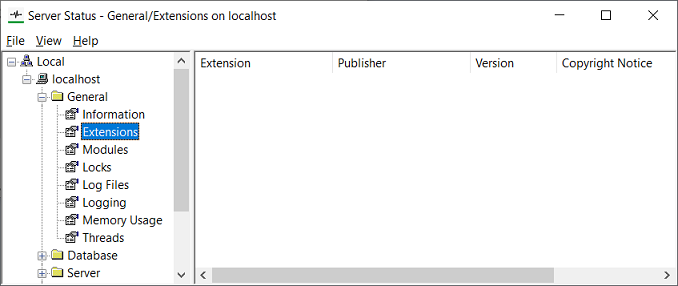 You can use the Server Status Tool to find out which extensions (if any) you have installed on a Geo SCADA Expert server. The installed extensions are listed in the General>Extensions section. You can also see information about the Version and the Publisher of each extension (see ‘Extensions’ in the ‘General System Status Information’ section of the Geo SCADA Expert Guide to the Server Status Tool).