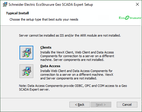 If you select Clients or Data Access, the Geo SCADA Expert Installer displays the Ready to Install page (see Ready to Install).
