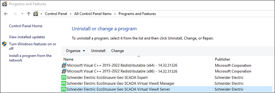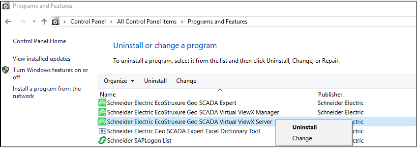 6. Select Schneider Electric EcoStruxure Geo SCADA Virtual ViewX Manager in the list of programs.