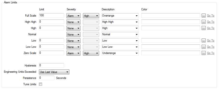 - Tune Limits: Use to define whether an Analog Point’s limits can be tuned (see Define whether an Analog Point’s Limits can be Tuned in the Geo SCADA Expert Guide to Core Point Configuration).
