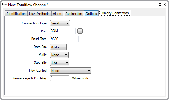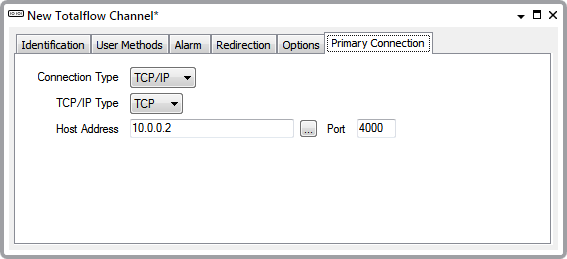 Totalflow channels are able to use either one or two communications ports, depending on your system setup. Communications can be either Serial or TCP/IP. Use the fields on the <Primary Connection> tab to configure the connections type and the associated settings.