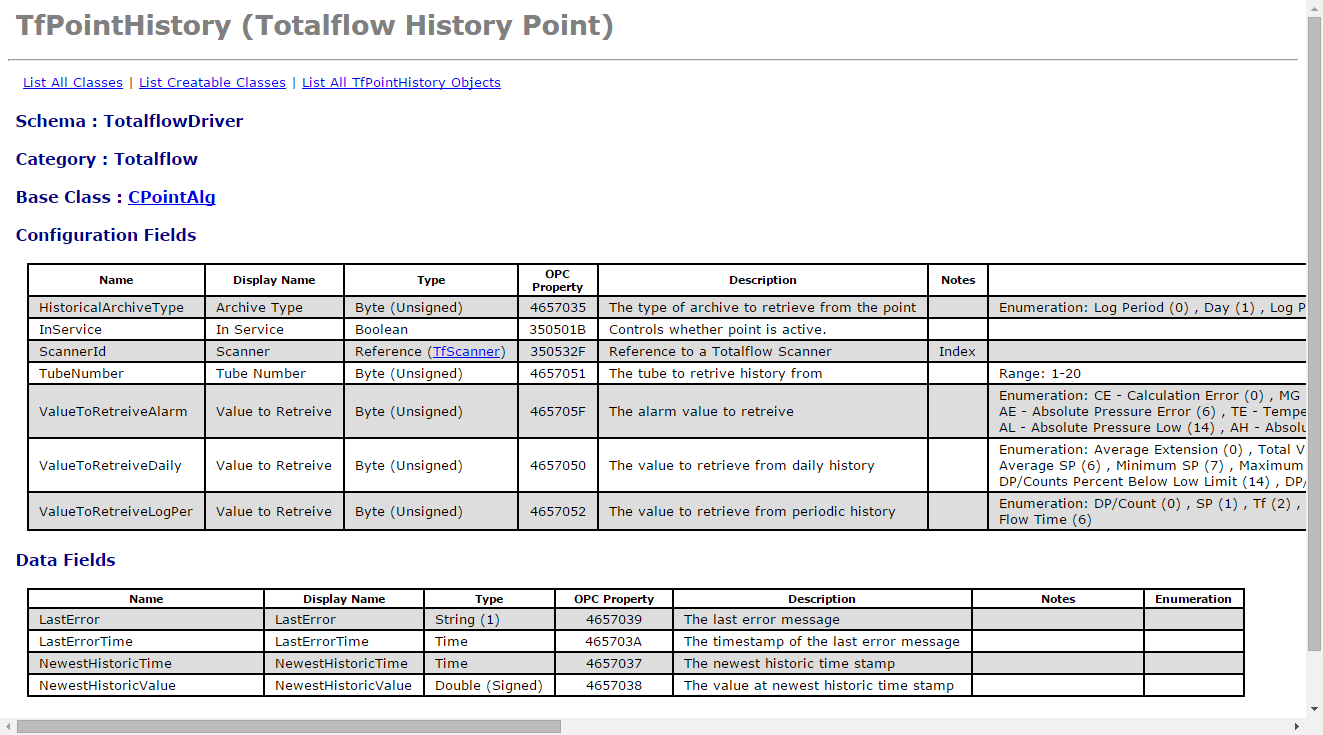 The schema for the Totalflow History Point is at http://localhost/schema/TfPointHistory. The schema lists the configuration fields, data fields, aggregates and methods, along with descriptions. The schema is generated dynamically, when the object definitions are loaded on database startup.