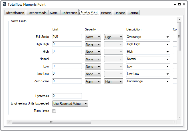 Use the Historic tab to define data storage properties for a point (see Defining Historic Details for a Point in the Geo SCADA Expert Guide to Core Point Configuration). This tab is only displayed for points that can support historic data.