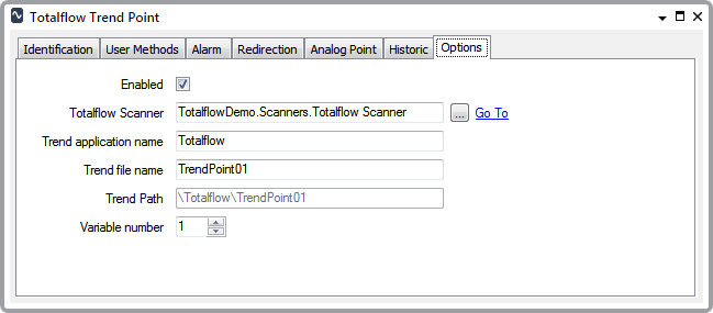 Display the Properties window for a Totalflow Trend Point object and then select the Options tab.
