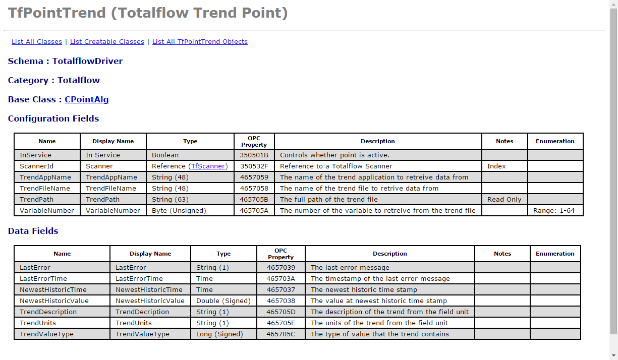 The schema for the Totalflow Trend Point is at: http://localhost/schema/TfPointTrend. The schema lists the configuration fields, data fields, aggregates and methods, along with descriptions. The schema is generated dynamically, when the object definitions are loaded on database startup.