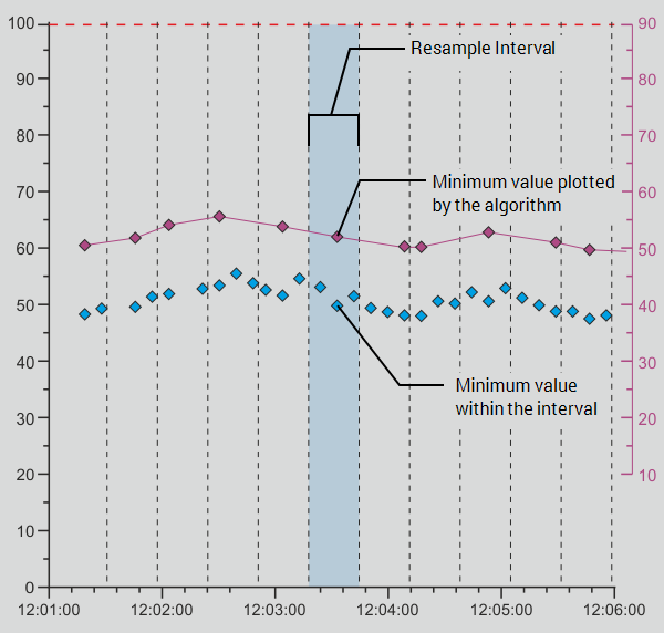 The Min Time algorithm works in the same way as the Max Time algorithm except that it calculates the lowest value in a sample rather than the highest.