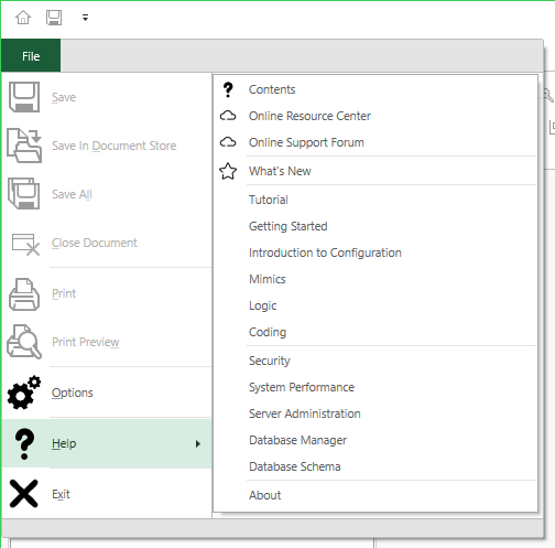 The links to the webpages on the Schneider Electric Community website might be omitted from the Help menu. A registry setting can be used to remove the options if they are not required (for example if your computer does not have Internet access). For more information, see Remove the Links to Online Internet Sites.