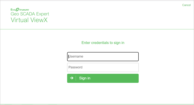 To use a Virtual ViewX client to interact with Geo SCADA Expert, you have to log on via a user account (just like with ViewX clients).