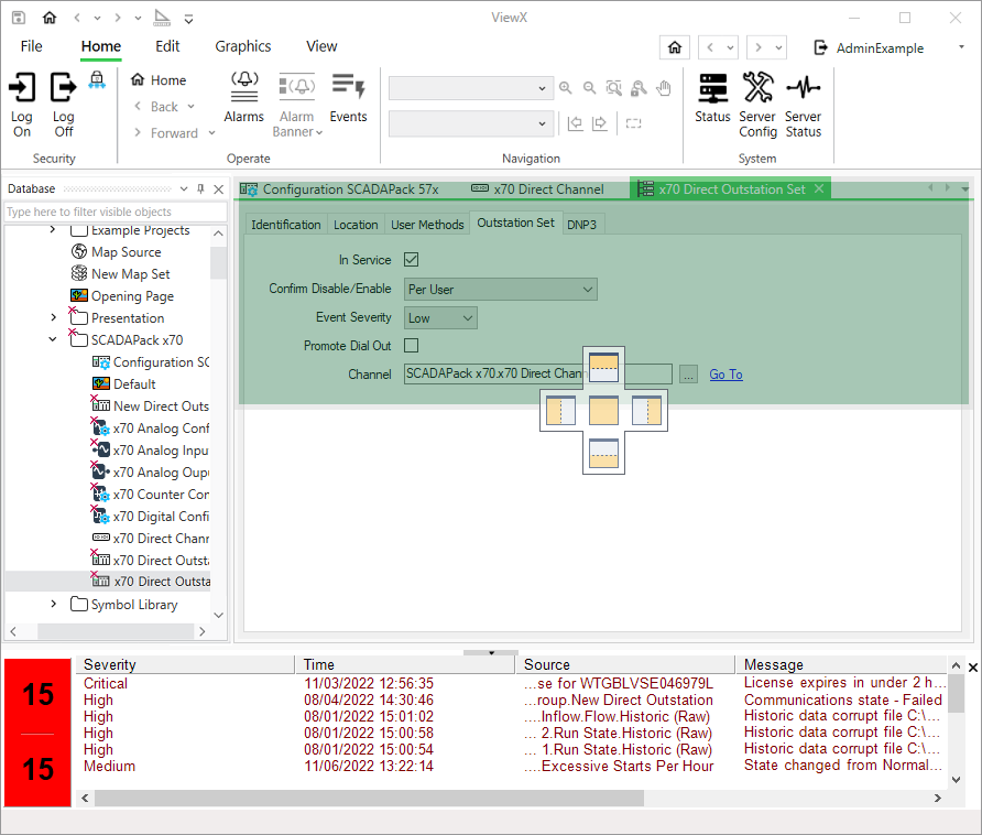 When you drag a floating window within the boundaries of a ViewX client Window Container, the interface highlights the available docking locations for the window that you are moving. This is achieved through a set of docking icons that indicate where you can place the floating window.
