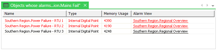 The List is empty if the selected ‘Parent Alarm Object’ item is not currently suppressing any ‘child’ items. (In other words, if the parent item's status does not fulfill the specific criteria that is configured to suppress alarms on any ‘child’ items, and any Unsuppress Delay has expired.)
