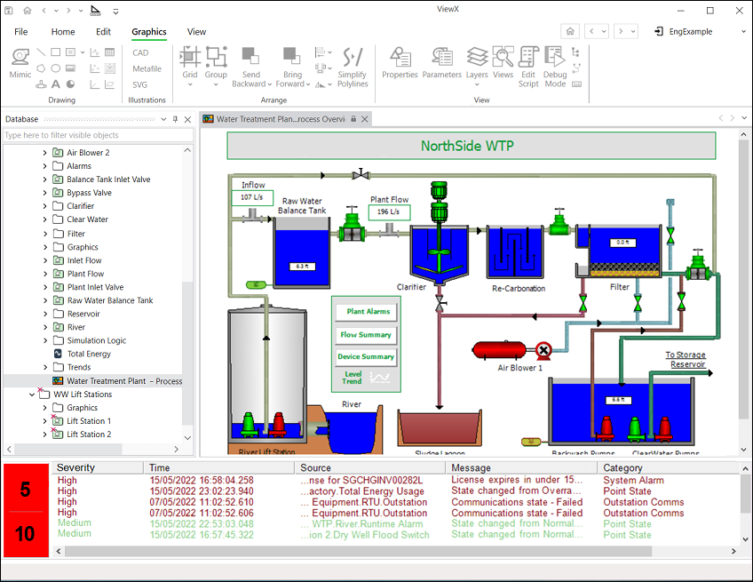 You can use a ViewX client to perform a wide range of tasks on your Geo SCADA Expert system, including issuing controls, responding to alarms, and configuring the database. However, your user permissions may restrict access to features depending on your duties. For example, operator-level users are often able to use ViewX to monitor a system and respond to alarms, but are denied access to configuration features.