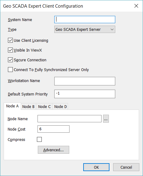 To add or edit a connection between a Virtual ViewX server and a Geo SCADA Expert system, you need to use the Client Configuration window. This window contains the settings that allow you to define the properties of the Virtual ViewX server - system connection, including the type of connection and the node settings.