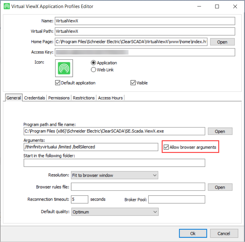 You can opt to include the URL to the relevant Alarm View on the Virtual ViewX server (rather than to the WebX server) in alarm redirection e-mails (see E-Mail Settings). To enable the Virtual ViewX URL to work, the Allow browser arguments check box has to be selected in the Virtual ViewX Manager. To check this: