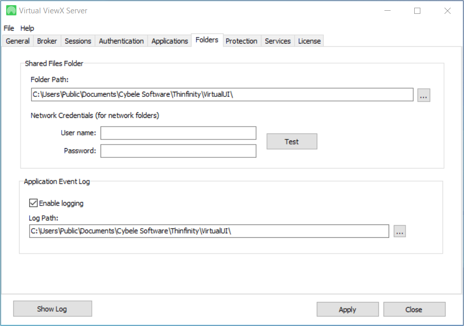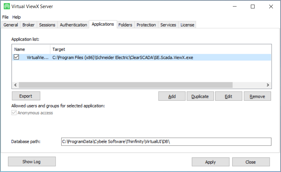 This tab shows the location at which the screen virtualization software is stored. We recommend that you do not alter the files at this location. This software is integrated with Virtual ViewX to provide web access to the Geo SCADA Expert database.