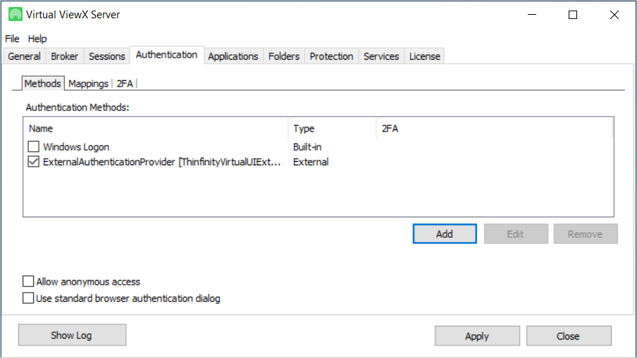 This tab shows the authentication method used for user access to Virtual ViewX.