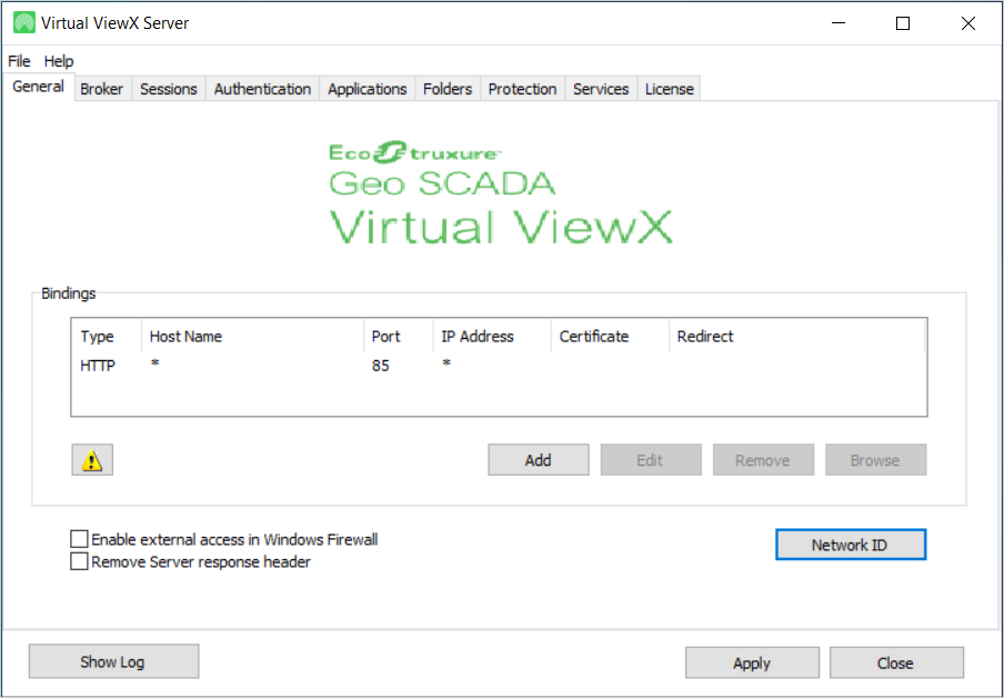 A Network ID button is included on the tab. The Network ID identifies the server installation and is used by the Virtual ViewX License Server. If you are deploying the Virtual ViewX License Server then the Network ID must be the same across all Virtual ViewX Servers that are accessing a common pool of licenses at the License Server. For more information, see the Geo SCADA Knowledge Base.