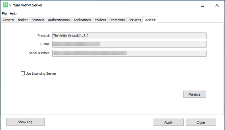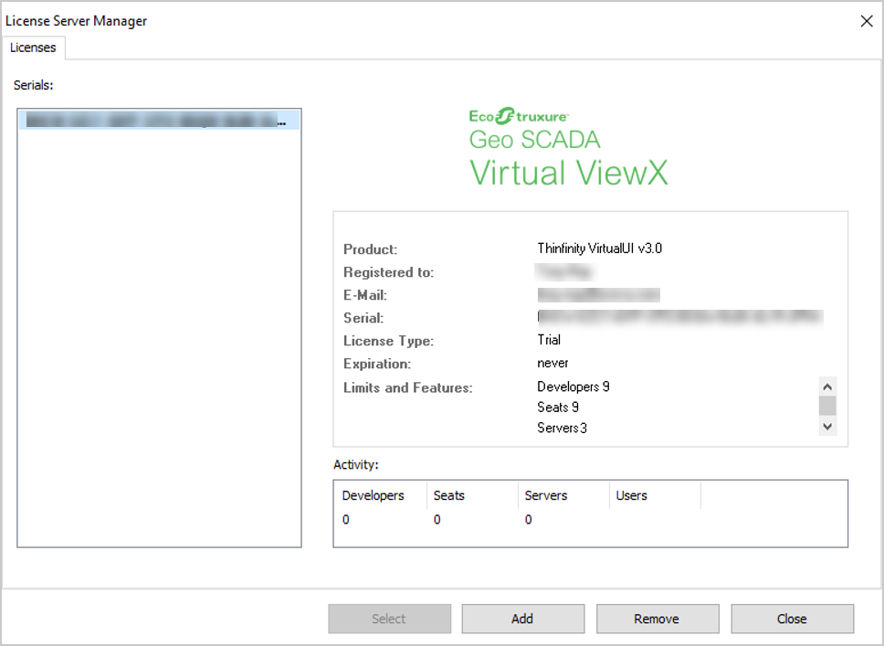 If you select the Manage button on this tab, you are presented with a window that provides further details about the Virtual ViewX license. This includes the number of ViewX servers and Virtual ViewX client users that the license supports. In the Activity field, you can also see the number of licenses that are currently in use for this particular Virtual ViewX server.