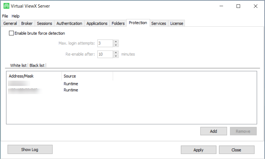 This tab includes a setting to configure a brute force password attack prevention. You can enable or disable the Enable brute force detection check box to enable/block settings to prevent unauthorized IP addresses from connecting. This setting can provide a similar level of protection as IIS does on server class operating systems, such as the ability to specifically block or allow certain IP addresses. The default setting is to allow only local connections to port 6580 because remote connections should be made via the IIS port and proxy.