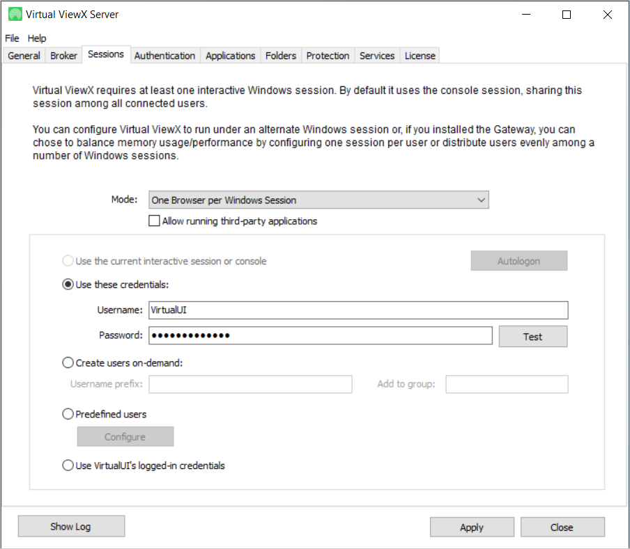 This tab indicates whether the Virtual ViewX session uses the default console session, or runs under an alternative Windows account. When Virtual ViewX is installed on a Windows Server Operating System, a user in the Remote Desktop group will be created and added here during the installation process. If the Virtual ViewX server is to provide access to Geo SCADA Expert from multiple client accounts, use one of the following configurations:
