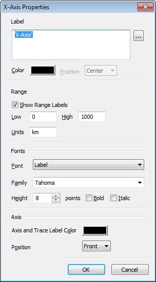 When you create a new X-Y-Z Plot, Geo SCADA Expert applies the default settings that are defined in the Options window (see Define the Default Settings for New X-Y-Z Plots). You can change the settings for an individual X-Y-Z Plot so that they differ from the default X-Y-Z Plot settings. This is useful when you want an X-Y-Z Plot to use, for example, different colors or fonts.