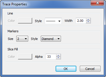 8. Use the Trace Properties button to display the Trace Properties window. Use the window to configure settings such as the width and style of trace lines. The settings work in a similar way to the settings that are available when you edit an X-Y-Z Plot (see Configure a Trace). The main difference is that the window only contains those properties that Geo SCADA Expert applies to traces on new X-Y-Z Plots automatically.