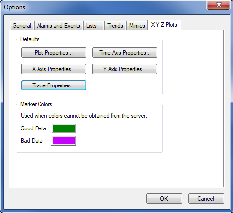 You can use the Options window to define the default settings for new X-Y-Z Plots. Geo SCADA Expert applies these settings to new X-Y-Z Plots automatically. By defining the default settings for X-Y-Z Plots, you may be able to reduce the amount of configuration required (depending whether your X-Y-Z Plots have similar settings).