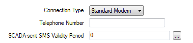 Specify the modem connection type that Geo SCADA Expert uses to send and receive SMS messages to and from the outstation. Select a combo box option. This will usually be Standard Modem. Other options may be available if they have been configured on the server (see PSTN Connection Types).