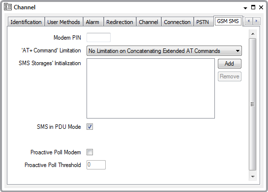 This threshold controls when Geo SCADA Expert polls the local GSM modem during periods of high SMS traffic. Specify a threshold number of SMS messages that is greater than 0. During periods of normal SMS traffic, Geo SCADA Expert polls the local GSM modem according to the standard Modem Poll Interval (see Defining PSTN Settings for a Channel).