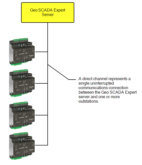 In a direct - single channel communications set-up, each Direct outstation in the set communicates with the Geo SCADA Expert server via a single uninterrupted connection. For example, an outstation could communicate with the Geo SCADA Expert server via a network connection, a radio connection, or a cable connection. The connection is permanently established.