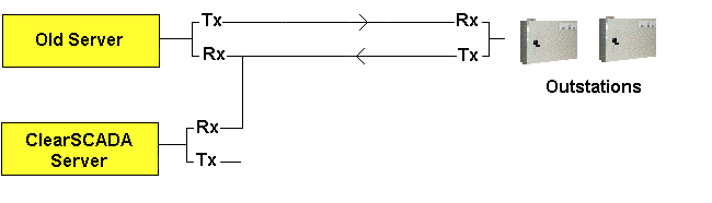 The Tx line of the new server’s connection to the existing system is disconnected. With this line disconnected, the new server cannot send data to the outstations, and therefore cannot affect the operation of the existing system.