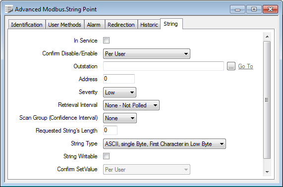Use the fields at the top of the String tab on the Advanced Modbus String Point Form to Configure Common Point Properties. Fields that are specific to Advanced Modbus String points are explained below.