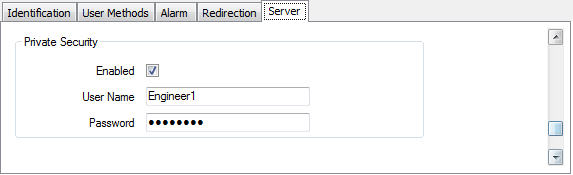 Some OPC DA servers support Private Security, whereby you have to log onto the server in order to access the data. Use the Private Security section of the tab to indicate if Private Security is supported, and if so, provide the credentials of a suitable Geo SCADA Expert User Account that provides the required access: