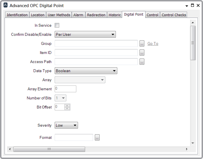 Configure the properties of each digital point using the fields on the Advanced OPC Digital Point Form.
