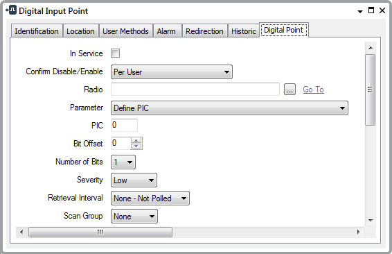 - Bit Offset—Only applicable if the Parameter field is set to Define PIC. Specify the lowest (starting) bit of the diagnostics parameter that Geo SCADA Expert is to read for this point. (Bit zero (0) is the lowest possible bit.)