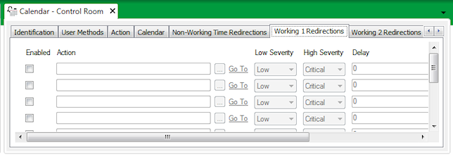 You use the fields on the Non-Working Time Redirections tab and the seven Working Redirections tabs on the Calendar Form to configure sets of alarm redirections. You can configure up to 10 alarm redirections or alarm redirection rosters per Redirections tab.