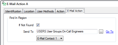 In case no users happen to be in the same region as the alarm, the properties in the Find In Region section of the tab are used to redirect alarms to a 'default' User Group named 'On-Call Engineers'. Geo SCADA Expert only redirects the alarms to the users in this User Group if no users happen to be in the same geographical region at the database item with which the alarm is associated, when the alarm redirection is triggered.